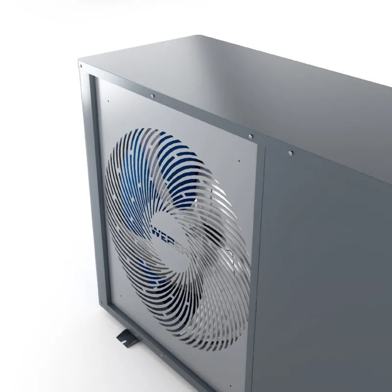Die WEBER-Wärmepumpe ist als Monoblock konzipiert. Das bedeutet, dass alle Komponenten außer dem Bedienfeld in einem einzigen, kompakten Gehäuse untergebracht sind, das im Außenbereich montiert wird. Dadurch ist der Einsatz auch in Gebäuden mit kleinem Heizraum möglich. Das Funktionsprinzip ähnelt dem anderer Kälteanlagen: Wärme aus der Außenluft wird über einen Ventilator an den Verdampfer der Pumpe übertragen. Im Verdampfer nimmt ein gasförmiges Kältemittel die Wärme auf und wird anschließend von einem Kompressor auf eine hohe Temperatur verdichtet. An diesem Punkt wird die Wärme über einen Plattenwärmetauscher, den sogenannten Kondensator, an das zirkulierende Wasser abgegeben. Das Wasser wird über Rohre ins Innere geleitet.